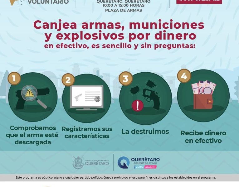 Para esta campaña se colocarán módulos de recepción de armas de fuego el 30 y 31 de agosto, así como el 1o y 2 de septiembre, en los municipios de Querétaro y El Marqués.