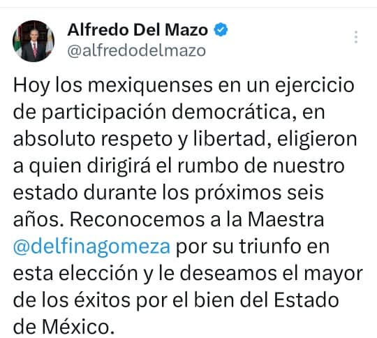 Como parte del triunfo que hasta el momento marcan las encuestas, en sus cuentas oficiales, «la maestra», tiene el recononicimiento del gobernador Alfredo del Mazo y el ex gobernador Eruviel Ávila.